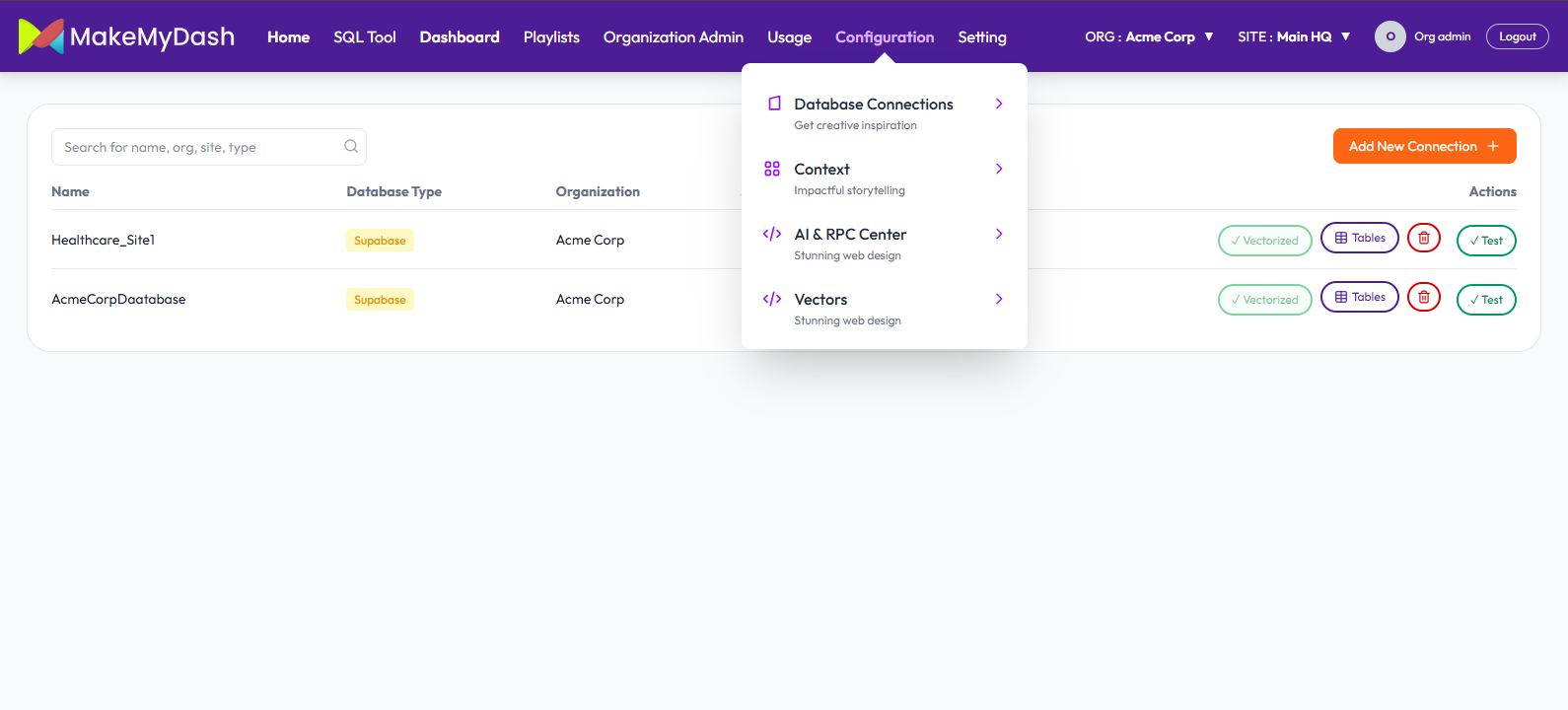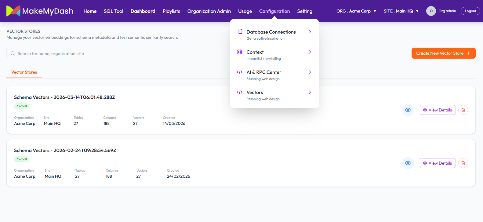 Click Configuration -> Vectors -> Create New Vector store Fill out the required fields (Store Name, Organizations, Site and select Database Connections).